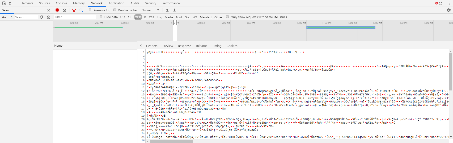 위의 예제와 같이 서버에서 파일 전송 요청을 처리해준다고 가정하자. header에서는 octet-stream 형식으로 던져주기 때문에 단순하게 자바스크립트에서 Ajax 요청을 받으면 아래와 같은 binary string을 받게 된다.
