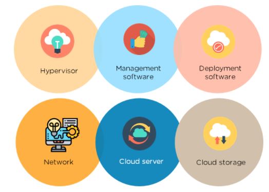 클라우드 컴퓨팅의 구성요소로는 크게 6가지가 있다. 하이퍼바이저, 매니지먼트 소프트웨어, 배포 소프트웨어, 네트워크, 클라우드 서버, 클라우드 스토리지로 구성된다.