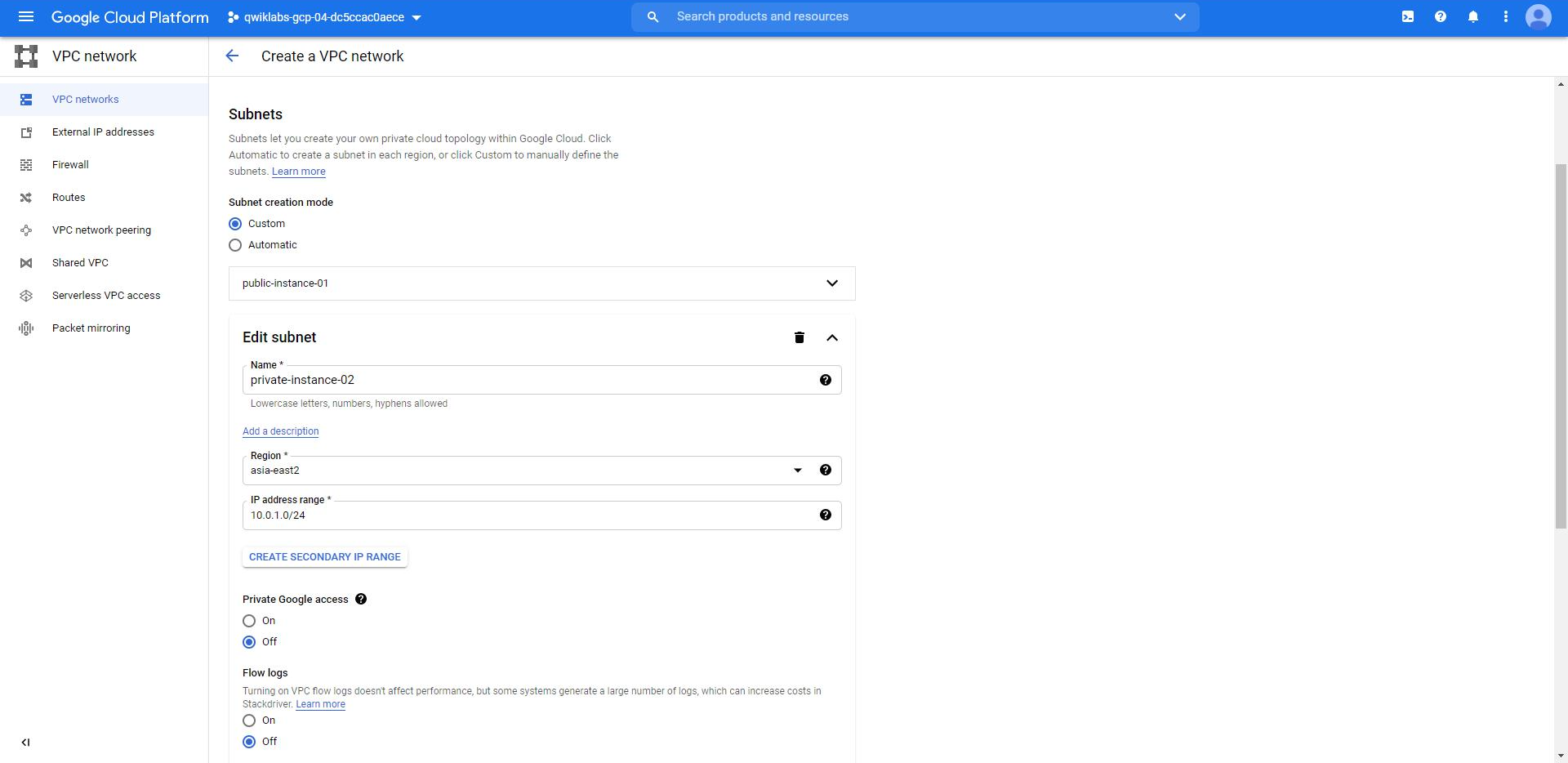 두번째 서브넷도 위와 비슷하게 생성해준다. 주의할 점은 IP 범위가 서브넷끼리 겹치면 안된다는 점이다. 먼저 생성한 IP 범위가 10.0.1.0/24라면 10.0.2.0/24 등의 범위로 설정해주면된다. 서브넷을 생성할 때 또 주의해야할 점이 있는데 이 서브넷 영역에서 리소스가 얼마나 생성될 지 미리 파악하고 있어야 한다는 점이다. 위의 예제에서는 서브넷의 IP 개수가 256개인데 256개 이상의 VM 인스턴스가 필요해진다면 VPC를 다시 수정해줘야한다.
