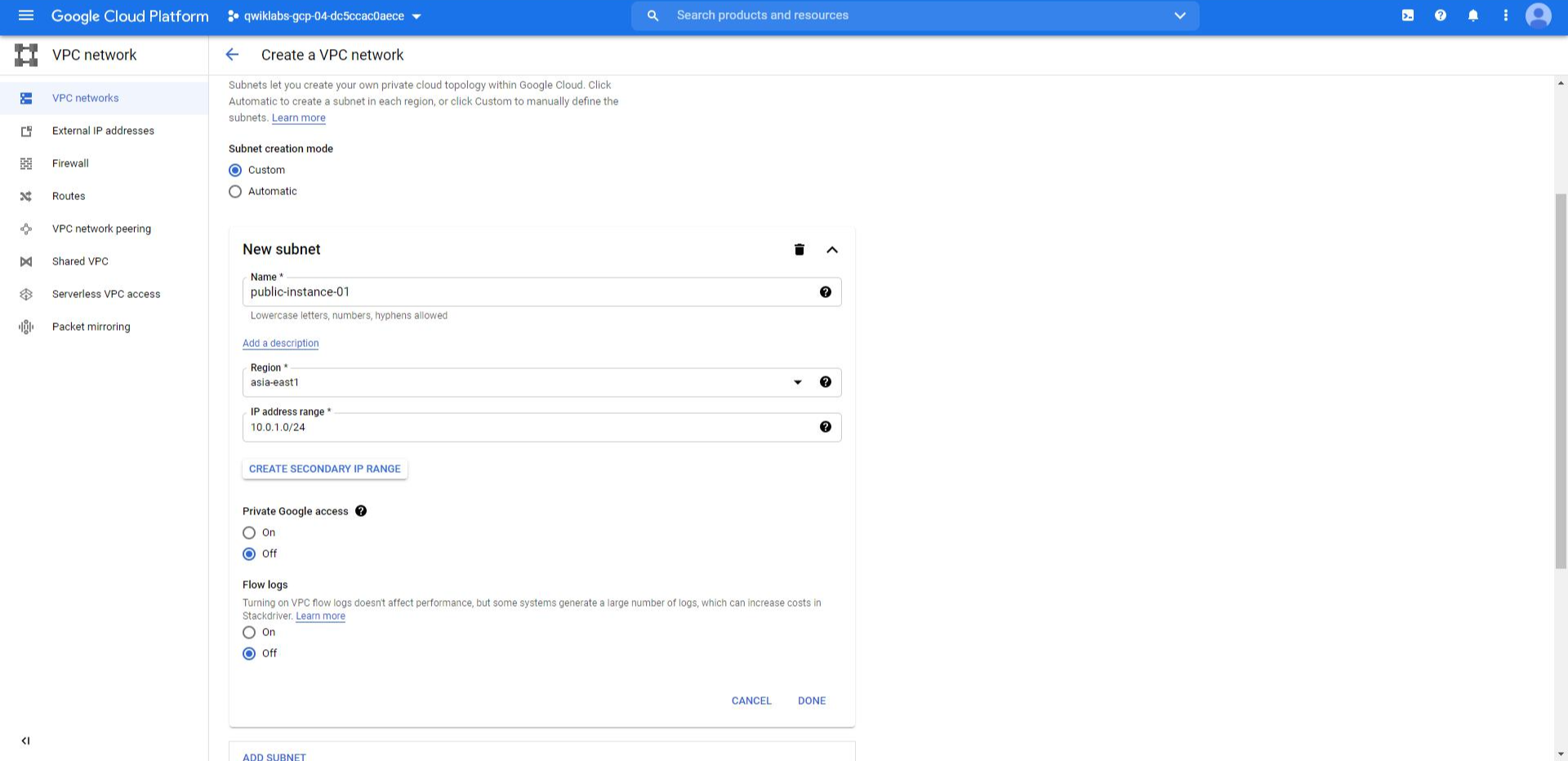 VPC 네트워크 목록란에서 create 버튼을 클릭하면 VPC 생성화면으로 진입한다. 이번 포스팅에서는 서브넷을 자동으로 생성하지 않고 직접 만들어본다. New subnet 항목에서 서브넷 이름을 입력하고 리전을 선택해준다. 다음으로 IP 범위를 설정해야하는데 위의 그림에서는 10.0.1.0/24로 설정했다. IP의 개수는 2^(32-24)개, 즉 256개이며 범위는 10.0.1.0 ~ 10.0.1.255까지이다.