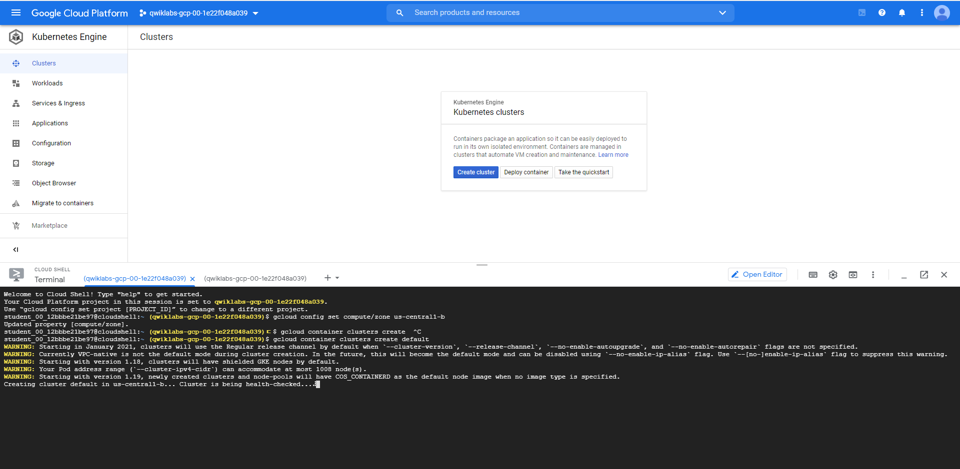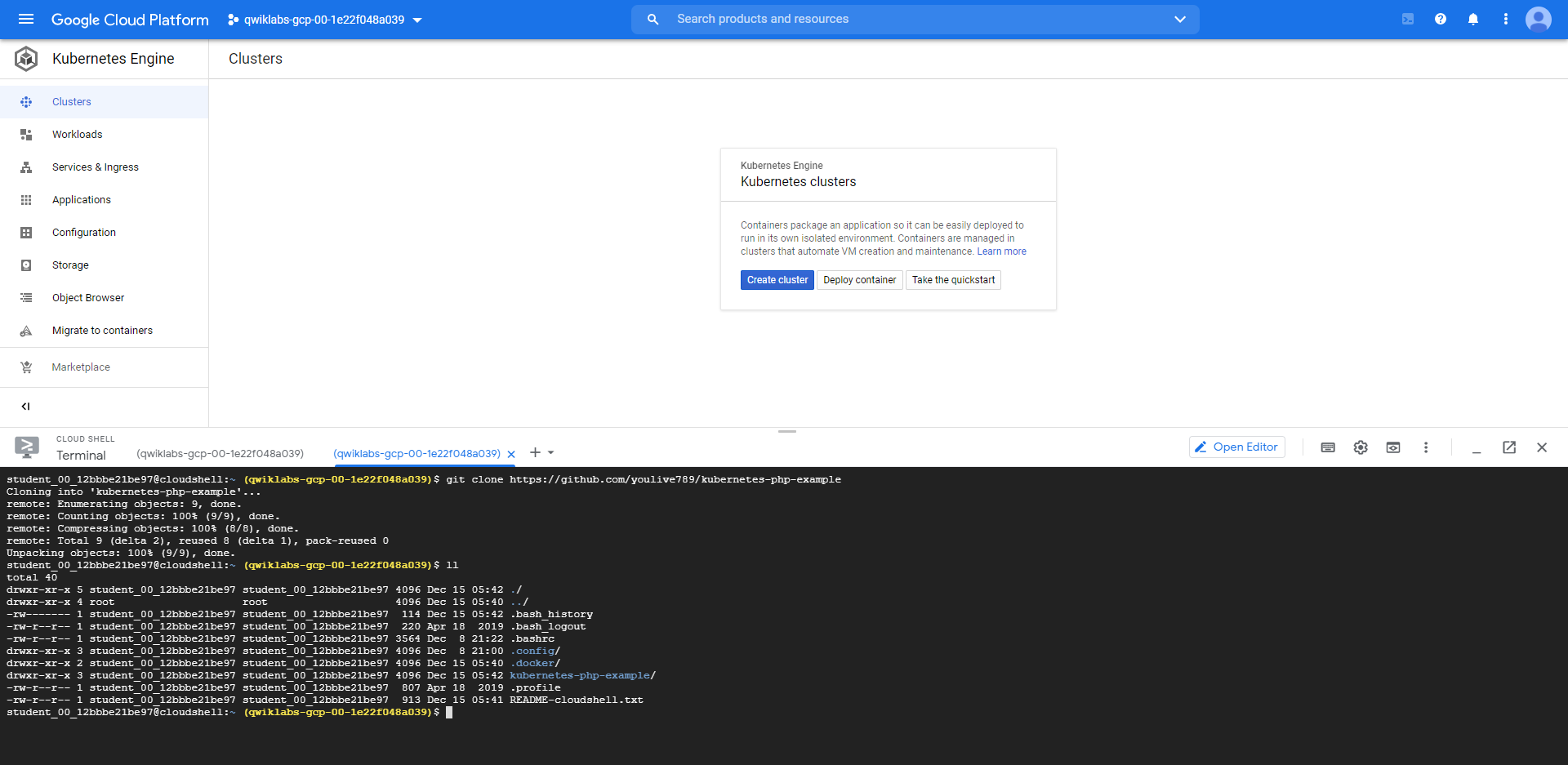 우선 GKE 클러스터를 생성해야 우리의 앱을 kubernetes에 배포할 수 있다. 위의 그림처럼 gcloud config set compute/zone 명령어로 프로젝트의 존을 설정했다. 그 다음 gcloud container clusters create [클러스터 이름] 명령어로 클러스터를 생성할 수 있다. GKE 클러스터를 생성하는 데에 시간이 좀 걸리기 때문에 쉘을 하나 더 생성해서 github 저장소에서 실습 소스를 클론하자.