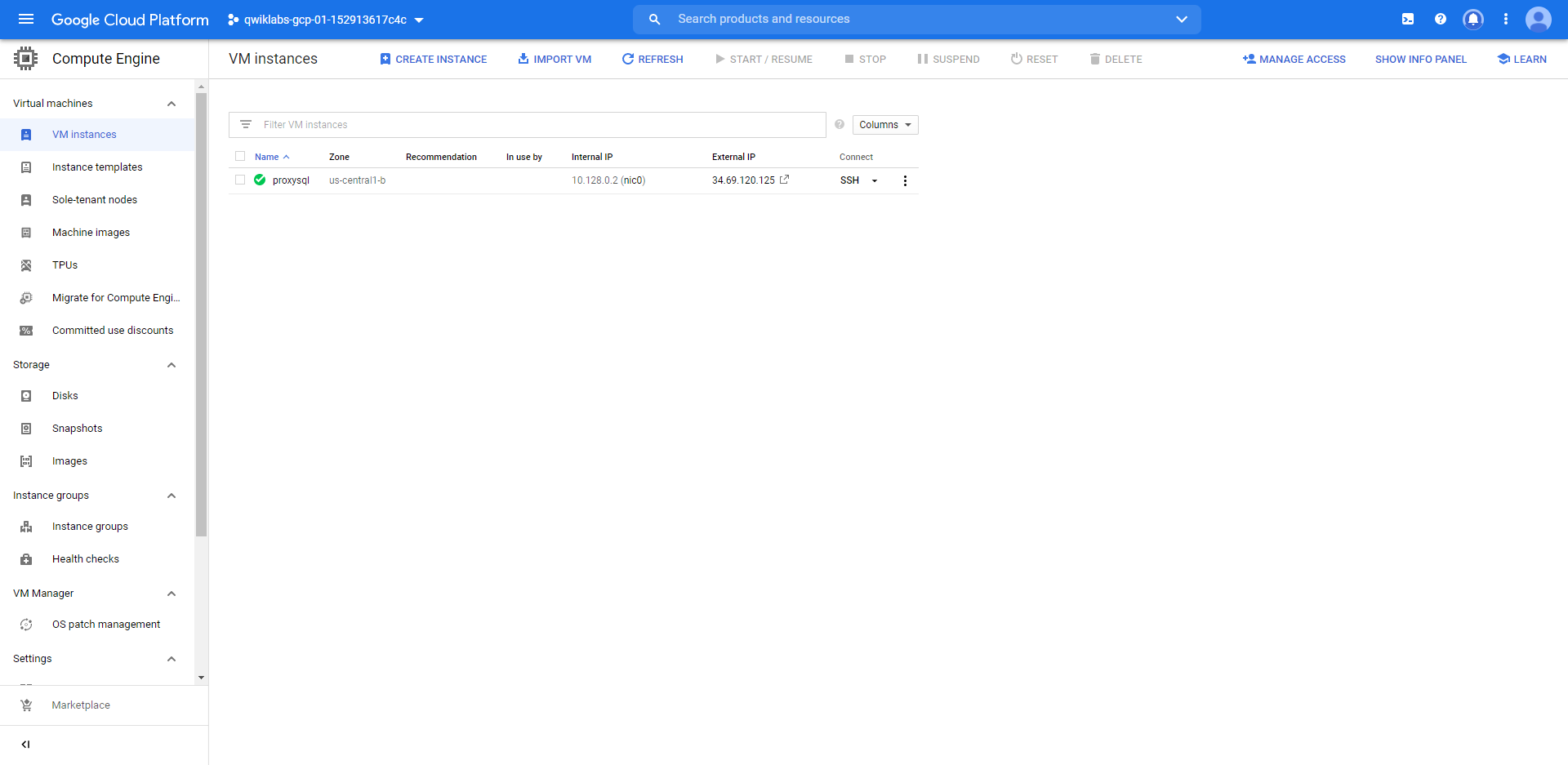 위와 같이 MySQL 인스턴스를 생성했다. 만약 인스턴스에 입력할 데이터가 있다면 입력하는 것을 추천한다. 그러면 ProxySQL로 실제 쿼리 트래픽이 분산되는지 확인 할 수 있을 것이다. MySQL 인스턴스 생성 완료되는 데에 시간이 오래걸린다. 이 때 ProxySQL 서버로 사용할 VM 인스턴스를 하나 생성해주자.