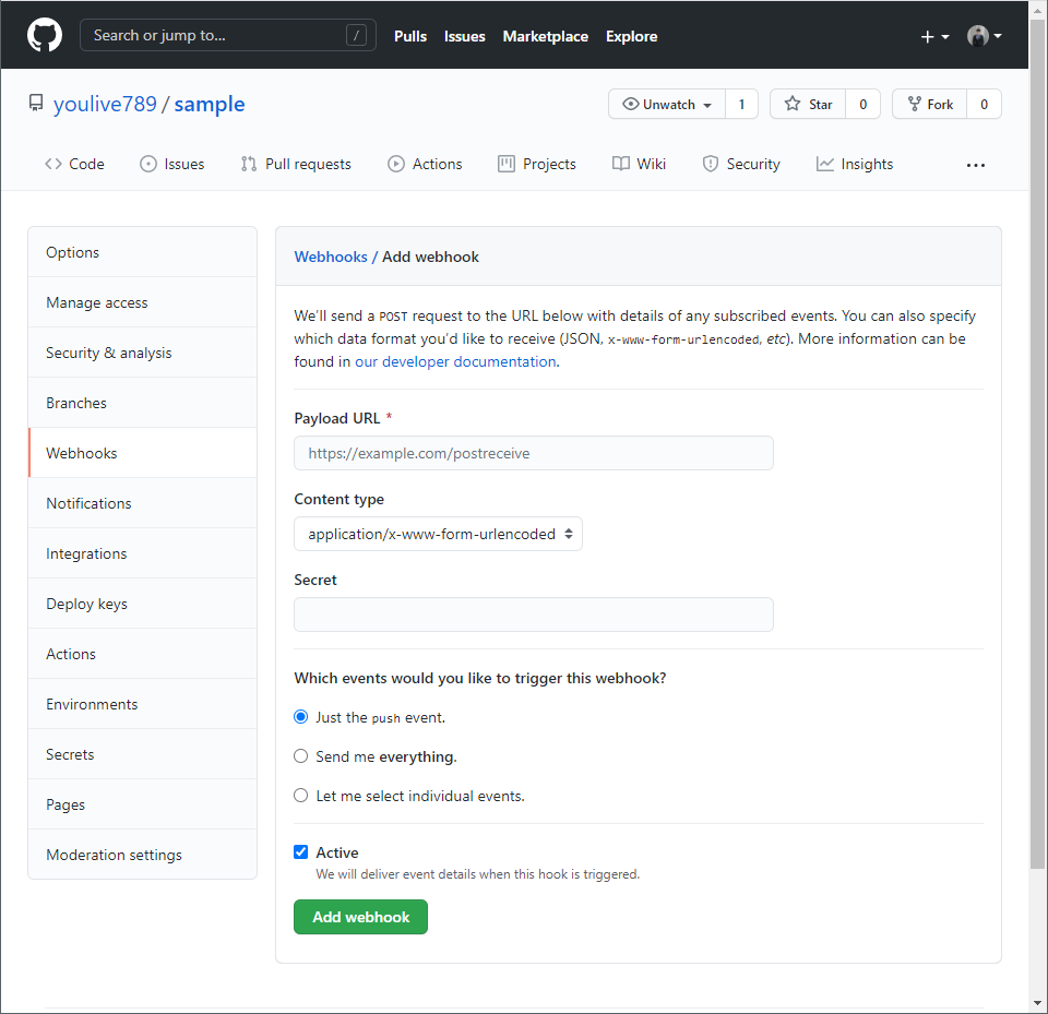 - repo, admin:repo_hook 스코프를 설정해야한다.